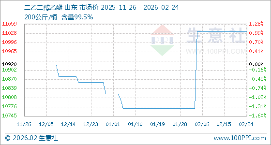 2月24日,生意社二乙二醇乙醚基准价为11033.33元/吨,与本月初(10771.43元/吨)相比,上涨了2.43%。