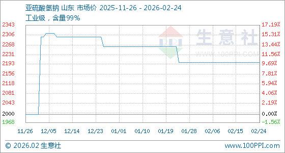 2月24日,生意社亚硫酸氢钠基准价为2200.00元/吨,与本月初持平。