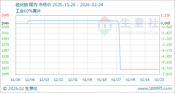 2月24日,生意社硫化钠基准价为1900.00吨,与本月初持平。