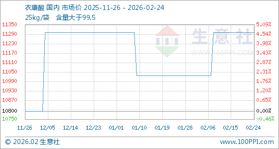 2月24日,生意社衣康酸基准价为11300.00元/吨,与本月初(11025.00元/吨)相比,上涨了2.49%。