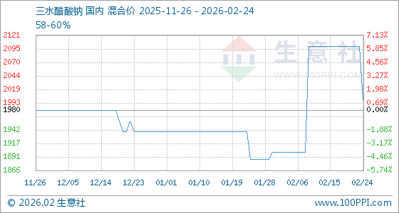 2月24日,生意社三水醋酸钠基准价为2100.00元/吨,与本月初(1900.00元/吨)相比,上涨了10.53%。