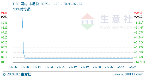 2月24日,生意社D80基准价为8200.00元/吨,与本月初持平。