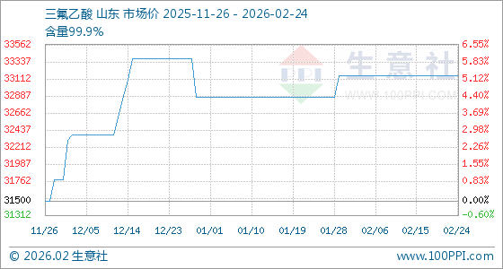 2月24日,生意社三氟乙酸基准价为33150.00元/吨,与本月初持平。