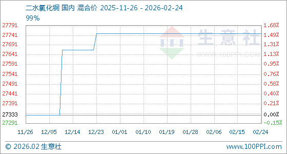 2月24日,生意社二水氯化铜基准价为27750.00元/吨,与本月初持平。