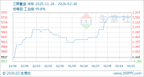 2月24日,生意社三聚氰胺基准价为5737.50元/吨,与本月初(5675.00元/吨)相比,上涨了1.10%。