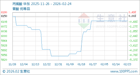 2月24日,生意社丙烯酸基准价为6116.67元/吨,与本月初持平。