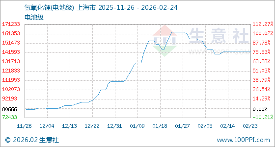 2月24日,生意社氢氧化锂(电池级)基准价为143000.00元/吨,与本月初(156000.00元/吨)相比,下降了8.33%。