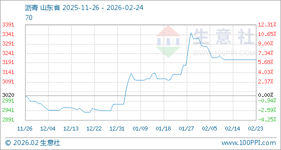 2月24日,生意社沥青基准价为3210.00元/吨,与本月初(3320.00元/吨)相比,下降了3.31%。