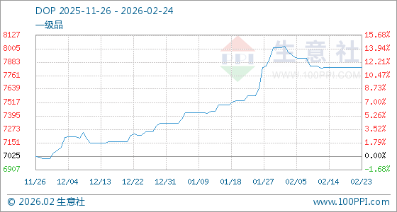 2月24日,生意社DOP基准价为7833.34元/吨,与本月初(8017.50元/吨)相比,下降了2.3%。
