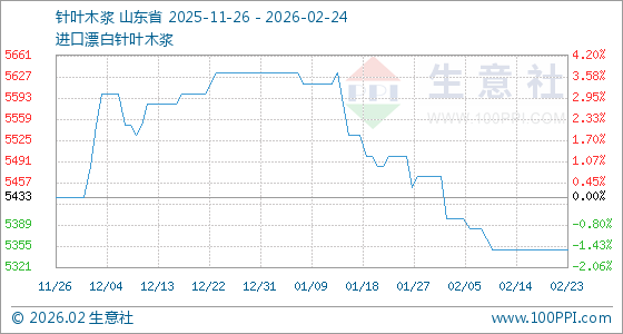 2月24日,生意社针叶木浆基准价为5350.00元/吨,与本月初(5466.67元/吨)相比,下降了2.13%。