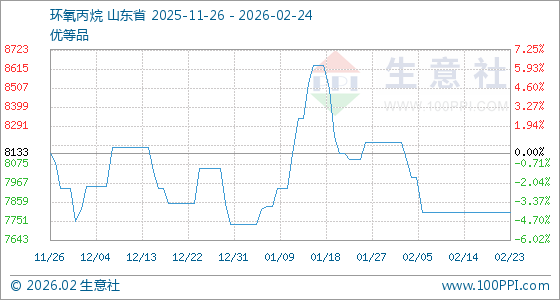 2月24日,生意社环氧丙烷基准价为7800.00元/吨,与本月初(8200.00元/吨)相比,下降了4.88%。