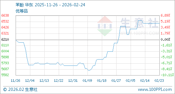 2月24日,生意社苯酚基准价为6500.00元/吨,与本月初(6450.00元/吨)相比,上涨了0.78%。