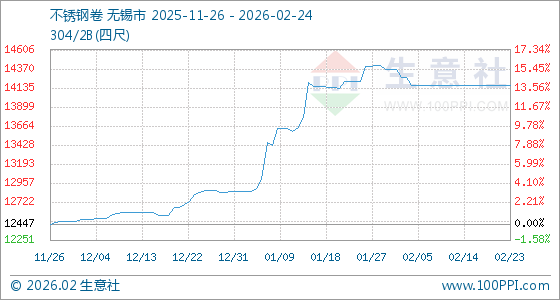 2月24日,生意社不锈钢卷基准价为14162.50元/吨,与本月初(14360.00元/吨)相比,下降了1.38%。