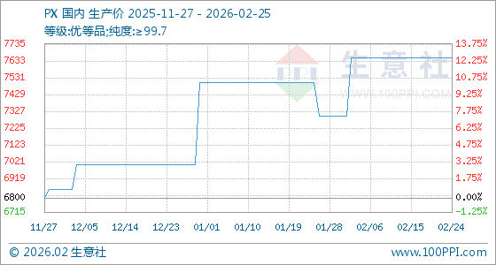 2月25日,生意社PX基准价为7650.00元/吨,与本月初(7300.00元/吨)相比,上涨了4.79%。