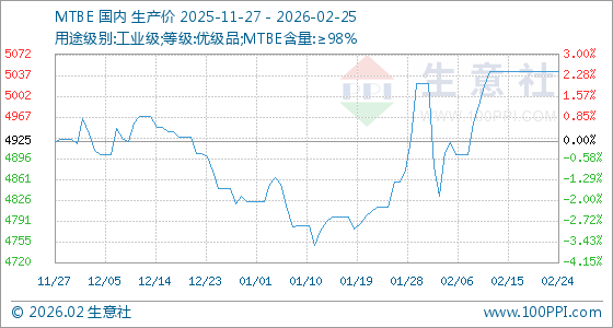 2月25日,生意社MTBE基准价为5043.33元/吨,与本月初(5023.33元/吨)相比,上涨了0.40%。