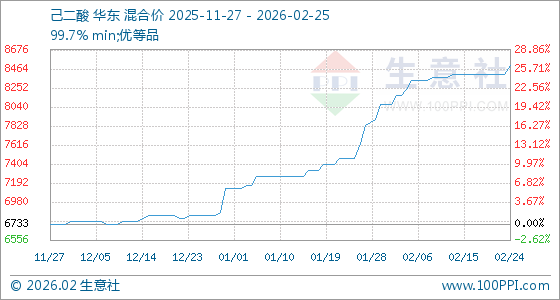 2月25日,生意社己二酸基准价为8500.00元/吨,与本月初(8066.67元/吨)相比,上涨了5.37%。