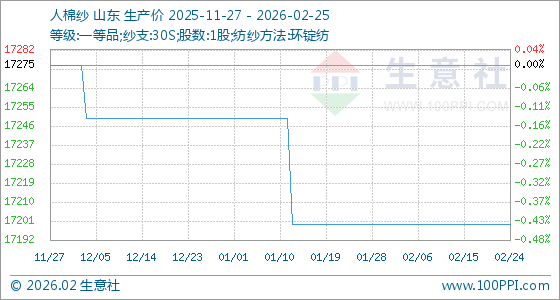 2月25日,生意社人棉纱基准价为17200.00元/吨,与本月初持平。