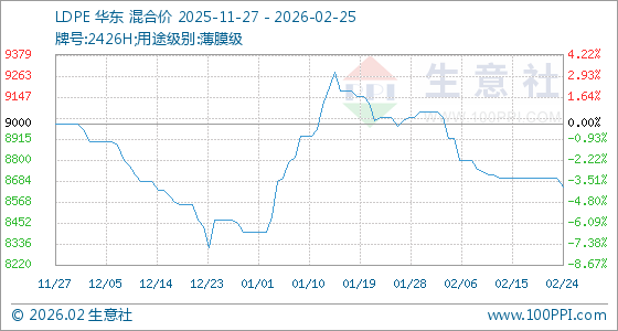 2月25日,生意社LDPE基准价为8650.00元/吨,与本月初(9066.67元/吨)相比,下降了4.6%。