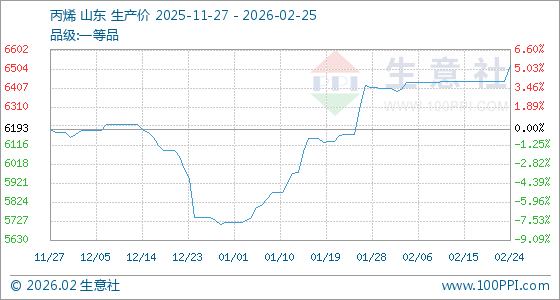 2月25日,生意社丙烯基准价为6521.00元/吨,与本月初(6404.33元/吨)相比,上涨了1.82%。