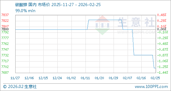 2月25日,生意社碳酸钾基准价为7700.00元/吨,与本月初(7825.00元/吨)相比,下降了1.6%。