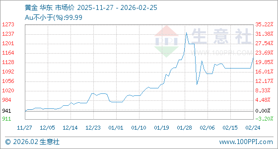 2月25日,生意社黄金基准价为1148.18元/克,与本月初(1199.84元/克)相比,下降了4.31%。