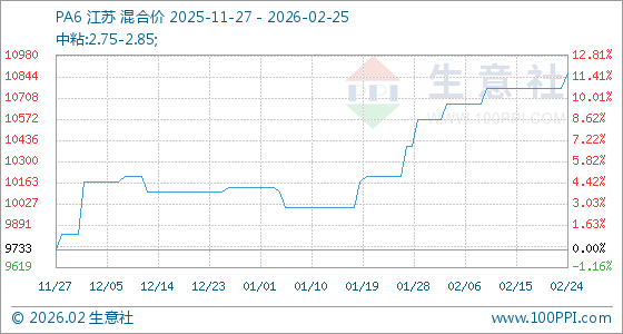 2月25日,生意社PA6基准价为10866.67元/吨,与本月初(10566.67元/吨)相比,上涨了2.84%。