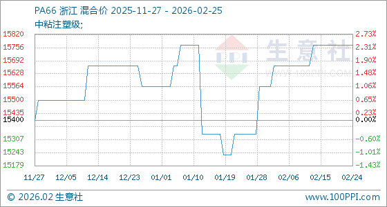 2月25日,生意社PA66基准价为15766.67元/吨,与本月初(15566.67元/吨)相比,上涨了1.28%。