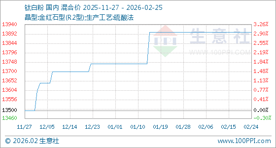 2月25日,生意社钛白粉基准价为13900.00元/吨,与本月初持平。