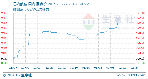 2月25日,生意社己内酰胺基准价为9883.33元/吨,与本月初(9573.33元/吨)相比,上涨了3.24%。