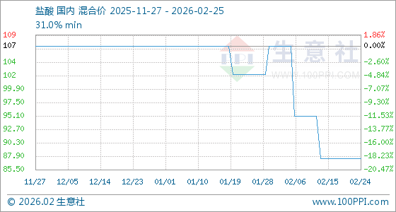 2月25日,生意社盐酸基准价为87.50元/吨,与本月初(107.50元/吨)相比,下降了18.6%。