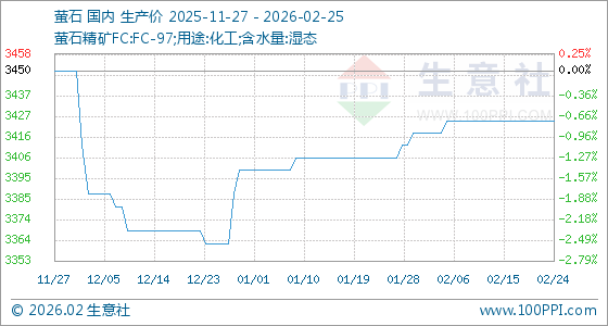 2月25日,生意社萤石基准价为3425.00元/吨,与本月初(3418.75元/吨)相比,上涨了0.18%。