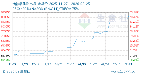 2月25日,生意社镨钕氧化物基准价为890000.00元/吨,与本月初(755000.00元/吨)相比,上涨了17.88%。