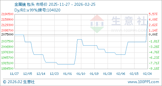 2月25日,生意社金属镝基准价为2165000.00元/吨,与本月初(1975000.00元/吨)相比,上涨了9.62%。