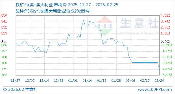 2月25日,生意社铁矿石(澳)基准价为769.89元/吨,与本月初(811.00元/吨)相比,下降了5.07%。