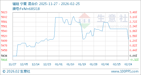 2月25日,生意社锰硅基准价为5504.00元/吨,与本月初(5550.00元/吨)相比,下降了0.83%。