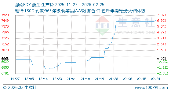 2月25日,生意社涤纶FDY基准价为7461.67元/吨,与本月初(7445.00元/吨)相比,上涨了0.22%。