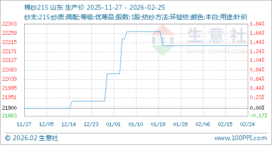 2月25日,生意社棉纱21S基准价为22200.00元/吨,与本月初持平。