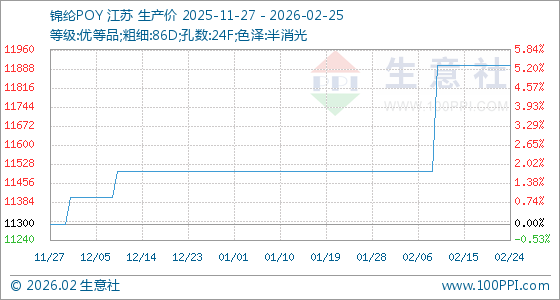 2月25日,生意社锦纶POY基准价为11900.00元/吨,与本月初(11500.00元/吨)相比,上涨了3.48%。
