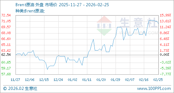 2月25日,生意社Brent原油基准价为71.11美元/桶,与本月初(69.59美元/桶)相比,上涨了2.18%。