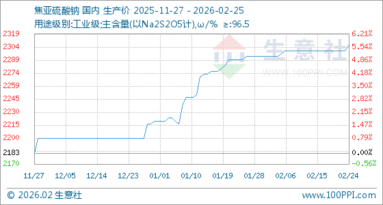2月25日,生意社焦亚硫酸钠基准价为2306.67元/吨,与本月初(2293.33元/吨)相比,上涨了0.58%。