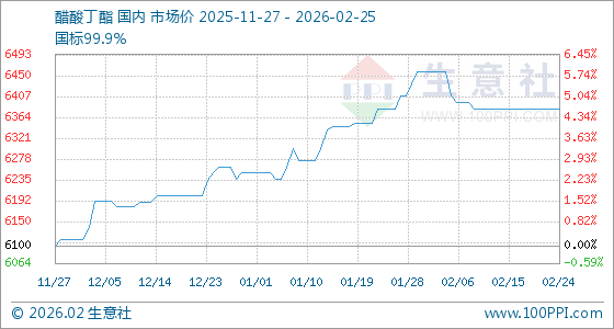 2月25日,生意社醋酸丁酯基准价为6382.50元/吨,与本月初(6457.50元/吨)相比,下降了1.16%。