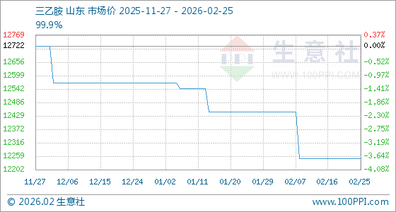2月25日,生意社三乙胺基准价为12250.00元/吨,与本月初(12444.44元/吨)相比,下降了1.56%。