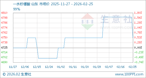 2月25日,生意社一水柠檬酸基准价为4800.00元/吨,与本月初(4750.00元/吨)相比,上涨了1.05%。