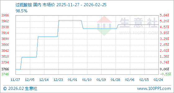 2月25日,生意社过硫酸铵基准价为3950.00元/吨,与本月初持平。