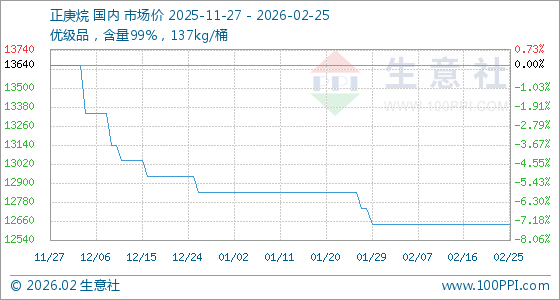 2月25日,生意社正庚烷基准价为12640.00元/吨,与本月初持平。