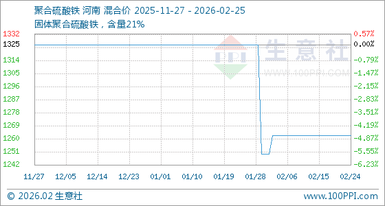 2月25日,生意社聚合硫酸铁基准价为1262.50元/吨,与本月初(1250.00元/吨)相比,上涨了1.00%。