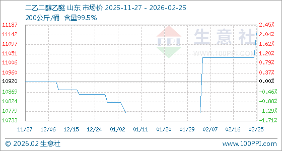 2月25日,生意社二乙二醇乙醚基准价为11033.33元/吨,与本月初(10771.43元/吨)相比,上涨了2.43%。