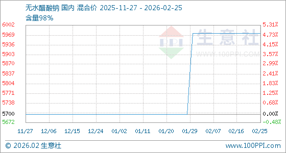 2月25日,生意社无水醋酸钠基准价为5975.00元/吨,与本月初持平。