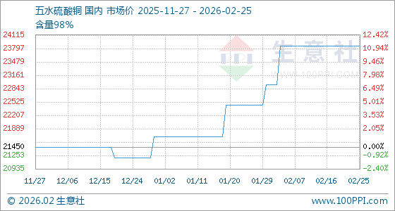 2月25日,生意社五水硫酸铜基准价为23850.00元/吨,与本月初(22933.33元/吨)相比,上涨了4.00%。