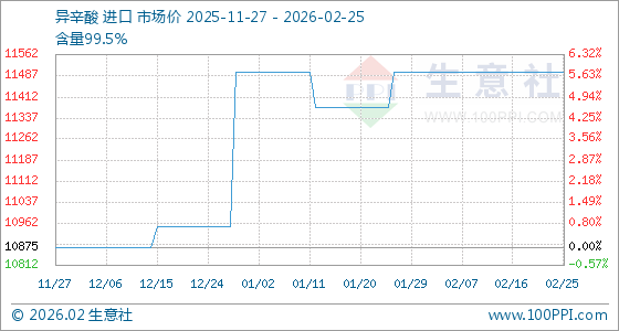 2月25日,生意社异辛酸基准价为11500.00元/吨,与本月初持平。